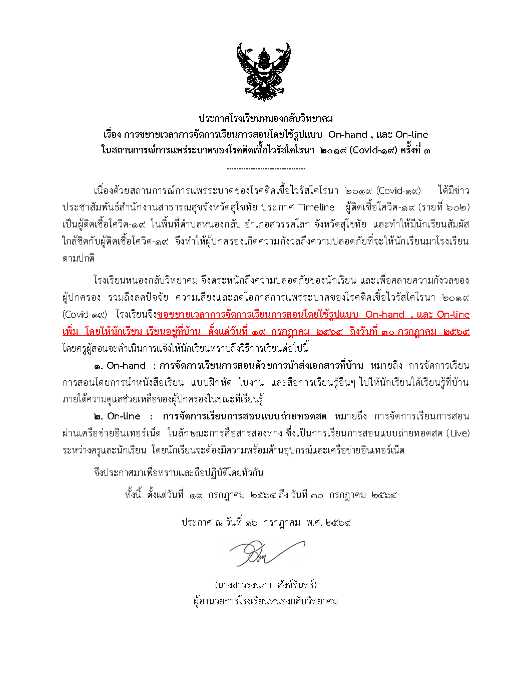 ประกาศ โรงเรียนหนองกลับวิทยาคม ขยายเวลาเรียนออนไลน์